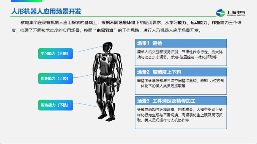 隨著技術(shù)的不斷進步,人形機器人正逐步從實驗室走向工業(yè)現(xiàn)場。李華綱認為,人形機器人具有學(xué)習(xí)能力、運動能力和作業(yè)能力等方面的優(yōu)勢,有望在核電裝備制造中發(fā)揮重要作用。李華綱表示,上海電氣核電集團已經(jīng)與國家地方共建人形機器人創(chuàng)新中心展開合作,正計劃從易到難、從局部到整體,集雙方之所長,逐步推進人形機器人在巡檢、高精度上下料、工件清理及精密加工等場景的應(yīng)用。