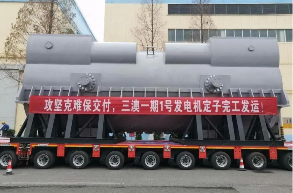 由東方電機(jī)有限公司承制的發(fā)電機(jī)總重量達(dá)724噸,其中定子455噸,是核電站單體部件最重的設(shè)備。發(fā)電機(jī)是常規(guī)島的另一位“主將”,它將源自汽輪機(jī)產(chǎn)生的機(jī)械能轉(zhuǎn)換為送往千家萬(wàn)戶的電能。該設(shè)備于2020年開(kāi)工制造,主要制造工序均在疫情期間進(jìn)行,設(shè)備團(tuán)隊(duì)駐廠推動(dòng)等方式加大資源投入,實(shí)現(xiàn)遠(yuǎn)程見(jiàn)證,克服了工廠封控、關(guān)鍵工序人員隔離、關(guān)鍵物料交貨推遲、四川停廠保電等多重困難,在極其艱難的情況下?lián)尰亓藢氋F工期。