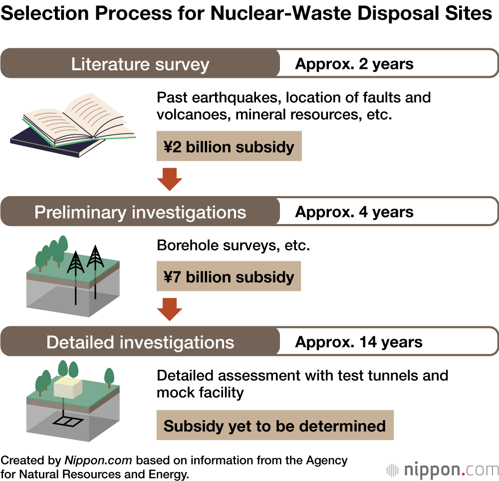 日本政府和核電站運營商長期以來一直在努力解決如何處理廢燃料和其他高放射性廢物的問題。當局最終決定將廢物埋入地下 300 米或更深的設施中。2002 年,日本核廢料管理組織 (NUMO) 開始尋找儲存地點,邀請各市政府將自己列為候選地點。到目前為止,這項“志愿者”政策只有三個參與者,即北海道的壽都町和神惠內町以及佐賀縣的玄海町。