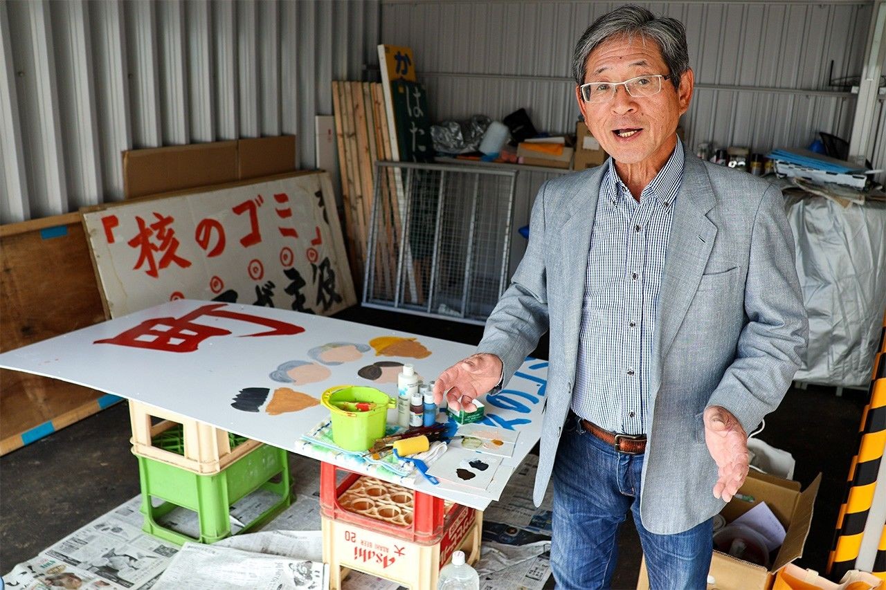 越前屋芳樹站在棚屋里,在當地就該問題舉行全民公投之前舉著反對調查的標語。(© Matsumoto Sōichi)