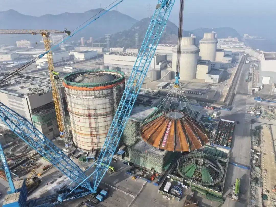 1月22日,三門核電3號機組屏蔽廠房鋼穹頂吊裝就位,為屏蔽廠房穹頂結構完工里程碑節點實現奠定了基礎。鋼穹頂由上口環梁、徑向梁、屋面板等構件組成,整體呈圓錐臺形,直徑約40米,高度約10米,位于屏蔽廠房頂部,吊裝總重超過1000噸。