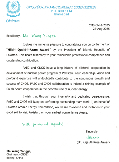 近日,巴基斯坦原子能委員會主席阿里·拉扎致信中國中原董事長王永革,祝賀他榮獲巴基斯坦國家榮譽(yù)獎?wù)?ldquo;新月勛章”,這一榮譽(yù)是對其在巴核能合作領(lǐng)域杰出貢獻(xiàn)的高度認(rèn)可。