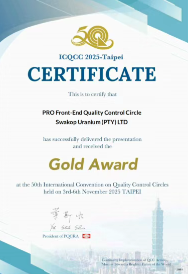 本次獲獎是斯科公司在前期獲得納米比亞政府質量獎第一名后,在質量管理領域取得的又一重要國際榮譽,是在中廣核集團和中廣核鈾業(yè)公司指導下實現質保體系有效性提升的具體成果,將為斯科公司實現更高質量、更可持續(xù)的發(fā)展以及世界一流礦山建設奠定堅實的基礎。
