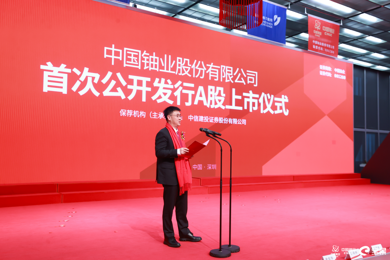 上市儀式現場,中核集團總經理、黨組副書記張濤,國家原子能機構系統工程司副司長王進軍,中核集團黨組成員、總會計師王學軍,中核集團黨組成員、副總經理陳軍利,國家產業基金董事長曲克波,中國國新控股有限責任公司黨委書記、董事長徐思偉,中信建投證券股份有限公司黨委副書記、總經理金劍華,中國鈾業黨委書記、董事長袁旭一同為中國鈾業敲鐘開市。中國礦業聯合會黨委書記、會長程利偉,中國核能行業協會常務副理事長曹述棟,深圳證券交易所黨委委員、副總經理李鳴鐘,保薦人(主承銷商)團隊、股東與公司管理層代表、中介機構代表以及媒體記者等共同見證了這一時刻。