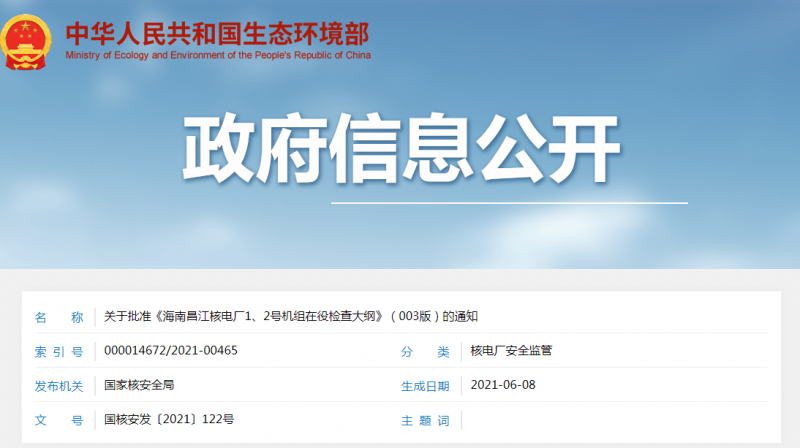根據《中華人民共和國核安全法》《中華人民共和國民用核設施安全監督管理條例》的有關要求,我局對你公司提交的申請文件進行了技術審評,認為你公司《海南昌江核電廠1、2號機組在役檢查大綱》(003版)是可以接受的,現予批準。