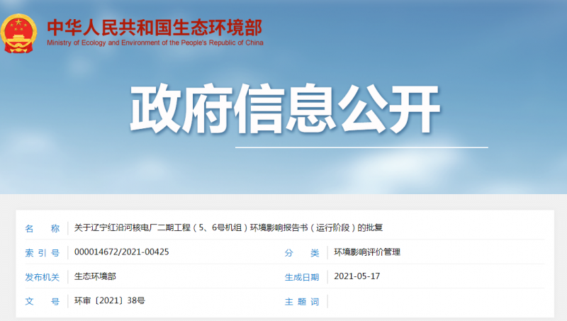 關于遼寧紅沿河核電廠二期工程(5、6號機組)環境影響報告書(運行階段)的批復
