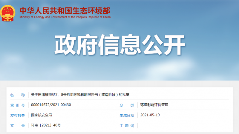 5月19日,國家核安全局發布《關于頒發田灣核電站7、8號機組建造許可證的通知》,國家核安全局通過組織檢查組對田灣核電站7號機組核島現場準備情況進行監督檢查,認為該機組現場各項準備工作已具備核島基礎澆筑第一罐混凝土的基本條件。