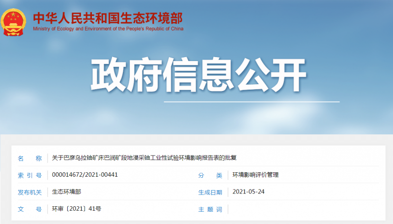 你公司《關于審查巴彥烏拉鈾礦床巴潤礦段地浸采鈾工業性試驗環境影響報告表的請示》(中鈾發〔2021〕83號)收悉。經研究,批復如下。