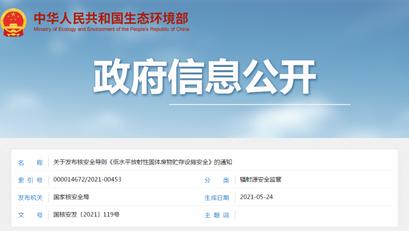 為進一步完善我國核與輻射安全法規體系,我局組織制定了核安全導則《低水平放射性固體廢物貯存設施安全》(HAD401/13-2021)。現予公布,自公布之日起實施。