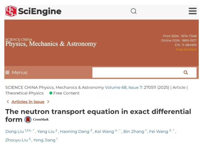 近日,由中國核動力研究設(shè)計院先進核能技術(shù)全國重點實驗室核工業(yè)智能科學計算團隊(AIDIND)牽頭,浙江大學、西安交通大學合作的研究成果純微分形式中子輸運方程已在中科院1區(qū)TOP頂刊《中國科學:物理學力學天文學》英文版2025年第7期正式發(fā)表。此項研究成果開發(fā)出一種利用人工智能結(jié)合純微分輸運方程形式的新方法,讓核反應堆中子輸運計算變得更快速、更高效。中子輸運方程是核科學領(lǐng)域描述中子從產(chǎn)生到消亡輸運過程的方程,精確高效的中子輸...