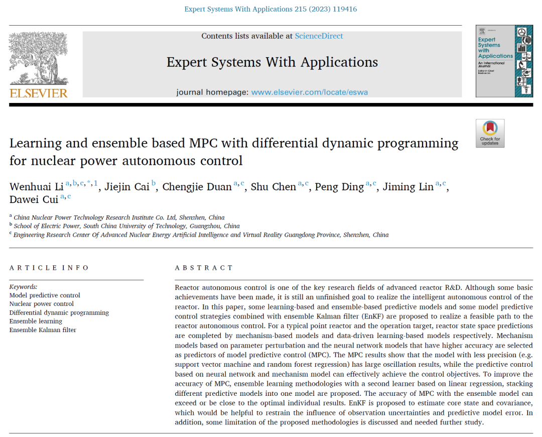 近日,以中廣核研究院有限公司為第一作者單位,題為《基于集成學習及微分動態規劃模型預測控制的核反應堆功率自主控制》(Learning and Ensemble based MPC with Differential Dynamic Programming for Nuclear Power Autonomous Control)的最新研究成果在人工智能領域國際核心期刊《專家系統與應用》(Expert Systems With Applications)上發表。