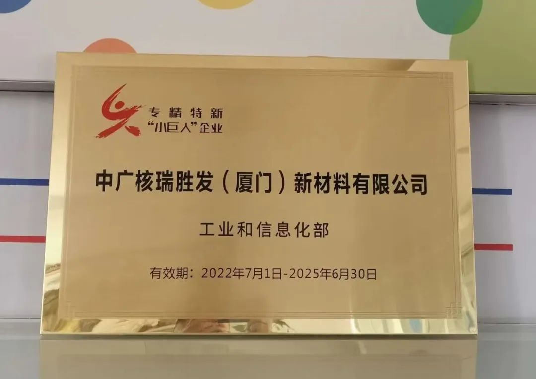 近日,中廣核技下屬中廣核瑞勝發(廈門)新材料有限公司(簡稱“中廣核瑞勝發”)收到國家工業和信息化部授予的專精特新“小巨人”企業牌匾,該稱號是全國中小企業評定工作中最高等級、最具權威的榮譽,標志著中廣核瑞勝發繼2021年獲福建省及廈門市專精特新中小企業認定后,在專業化發展、精細化產出、特色化工藝和自主創新能力等方面再次邁上新的臺階。