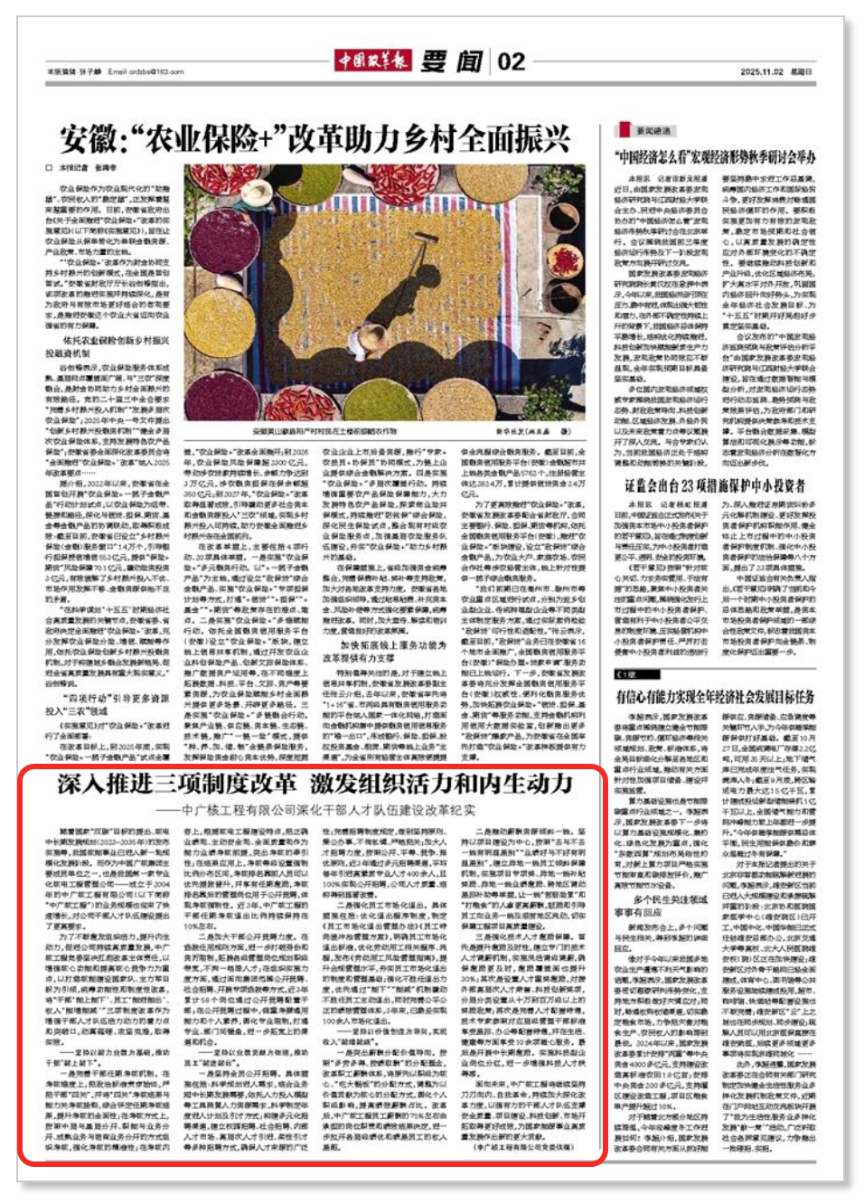 近日,《中國改革報(bào)》以《深入推進(jìn)三項(xiàng)制度改革 激發(fā)組織活力和內(nèi)生動力》為題,聚焦報(bào)道中廣核工程有限公司深化干部人才隊(duì)伍建設(shè)改革情況。在國家雙碳目標(biāo)和核電規(guī)模化發(fā)展背景下,中廣核工程以三項(xiàng)制度改革為突破口,推動干部能上能下、員工能進(jìn)能出、收入能增能減,激發(fā)組織活力與內(nèi)生動力,為助力國家能源事業(yè)高質(zhì)量發(fā)展提供實(shí)踐樣本。全文如下深入推進(jìn)三項(xiàng)制度改革 激發(fā)組織活力和內(nèi)生動力——中廣核工程有限公司深化干部人才隊(duì)伍建設(shè)改革...