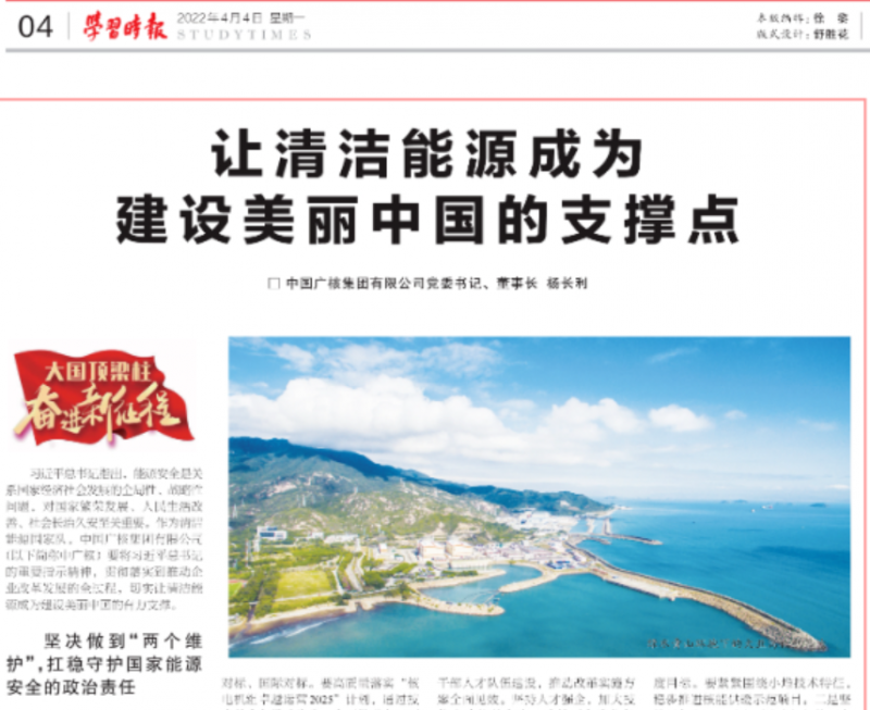 習近平總書記指出,能源安全是關系國家經濟社會發展的全局性、戰略性問題,對國家繁榮發展、人民生活改善、社會長治久安至關重要。作為清潔能源國家隊,中國廣核集團有限公司(以下簡稱“中廣核”)要將習近平總書記的重要指示精神,貫徹落實到推動企業改革發展的全過程,切實讓清潔能源成為建設美麗中國的有力支撐。