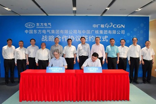 5月8日,中國東方電氣集團有限公司與中國廣核集團有限公司在深簽署戰略合作協議。東方電氣集團黨組書記、董事長俞培根,中廣核黨委書記、董事長、總經理楊長利共同見證簽約儀式。東方電氣集團公司黨組成員、副總經理徐鵬,中廣核黨委常委、副總經理郭利民代表雙方簽字。