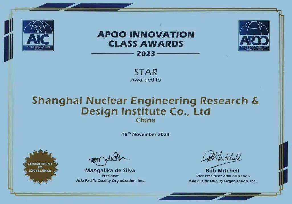本屆大會現場頒發了多個年度獎項,上海核工院榮獲亞太質量組織“2023年度創新獎”最高獎(STAR創新獎)。這也是該獎項自設立以來,中國核電企業首次獲此殊榮。