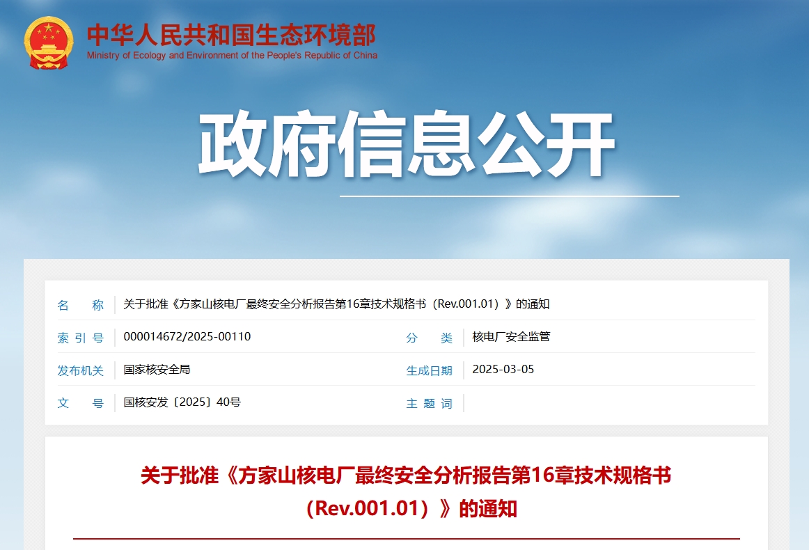 你公司《關于方家山核電廠最終安全分析報告第16章技術規(guī)格書(Rev.001.00)修改的請示》(中核運行核安發(fā)〔2024〕181號)、《關于懇請批準方家山核電廠最終安全分析報告第16章技術規(guī)格書(Rev.001.01)的請示》(中核運行核安發(fā)〔2025〕16號)收悉。