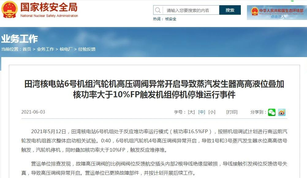 2021年5月12日,田灣核電站6號機組處于反應堆功率運行模式(核功率16.5%FP),按照機組調試計劃進行商運前汽輪發電機組首次整體啟動相關試驗。0:40,6號機組汽輪機4號高壓調閥異常開啟,導致1號和3號蒸汽發生器水位高高信號觸發,汽輪機停機,同時疊加核功率大于10%FP,觸發反應堆停堆。