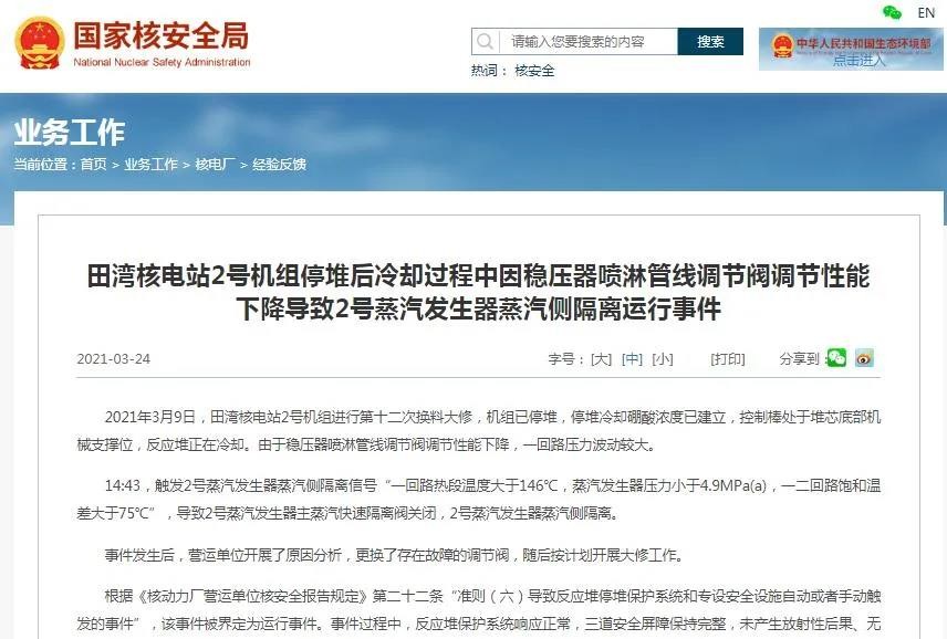 田灣核電站2號機組發生運行事件