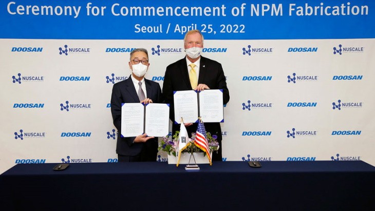 2022年4月26日,美國NuScale電力公司(NuScale Power)發布聲明稱,該公司已與韓國斗山能源公司(Doosan Enerbility)、韓國GS能源公司(GS Energy)和韓國三星集團(Samsung C&T)簽署諒解備忘錄,共同探索部署小型堆(SMR)的可能。