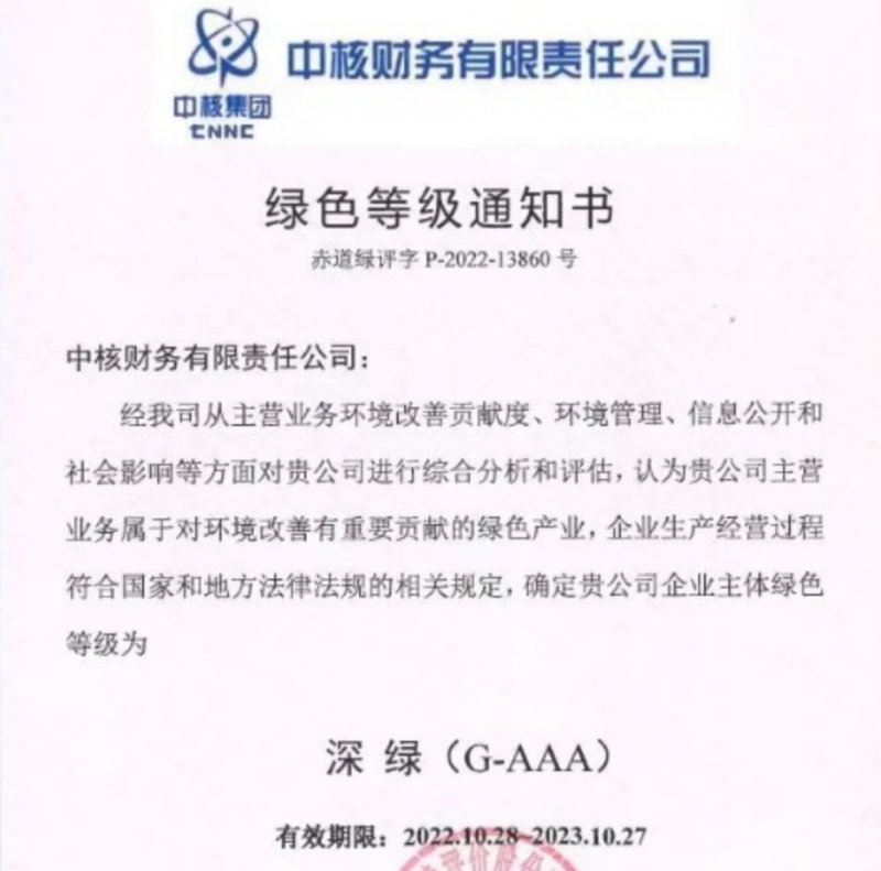 近日,經聯合赤道環境評價股份有限公司評估,認定中核財務公司屬于對環境改善有重要貢獻的綠色企業,確定公司獲得綠色企業最高等級“深綠G-AAA”主體認證。聯合赤道環境評價股份有限公司是國內權威的綠色金融評估認證機構,也是國內最大的信用信息服務機構之一。