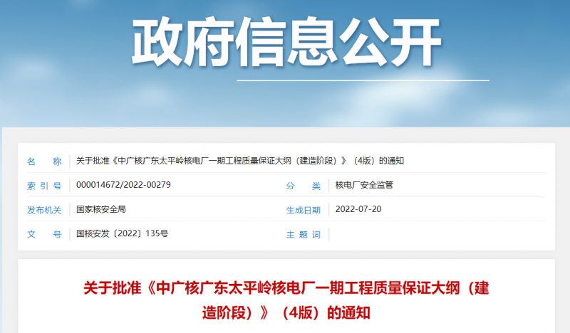 關于批準《中廣核廣東太平嶺核電廠一期工程質量保證大綱(建造階段)》(4版)的通知