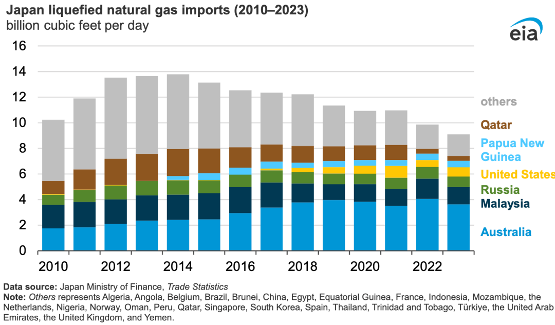 據(jù)美國能源信息署報道,2011年福島第一核電站事故發(fā)生后,日本暫停了剩余48座核反應堆的運行,幾乎完全依靠進口天然氣來彌補發(fā)電量的損失。2015年,日本允許其第一座核反應堆恢復運行。截至2022年12月,日本已有11吉瓦的核電裝機恢復使用,這減少了用于發(fā)電的液化天然氣進口。