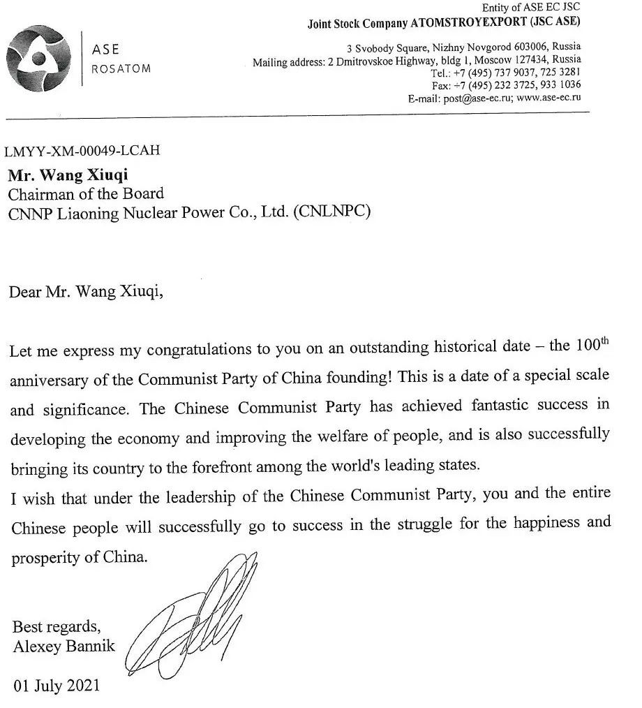 在中國共產黨成立100周年之際,中國核電旗下田灣核電、遼寧核電收到了來自俄羅斯原子能建設出口有限公司發來的賀信,對中國共產黨成立100周年表示祝賀。