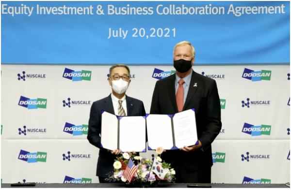 近日,韓國斗山重工(Doosan Heavy Industriesand Construction)與美國NuScale電力公司簽署了一項協議,將追加6000萬美元投資,繼續支持NuScale小型堆部署。另外,雙方還就擴大氫生產和使用小型堆實現海水淡化等方面合作達成一致。