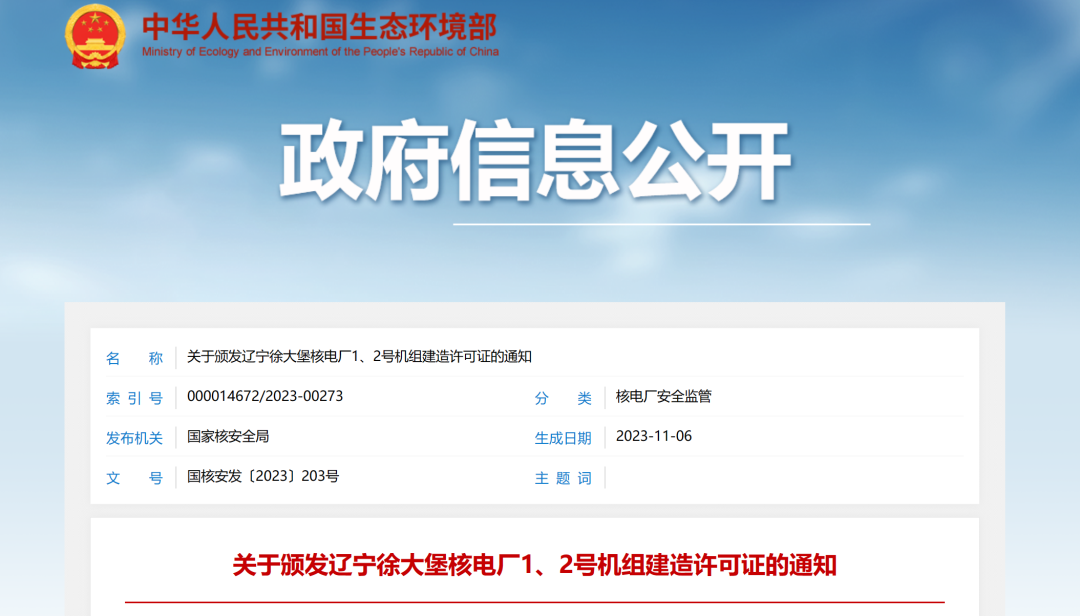 11月6日,生態(tài)環(huán)境部發(fā)布消息稱,國家核安全局決定向中核遼寧核電有限公司頒發(fā)《遼寧徐大堡核電廠1號機組建造許可證》和《遼寧徐大堡核電廠2號機組建造許可證》。
