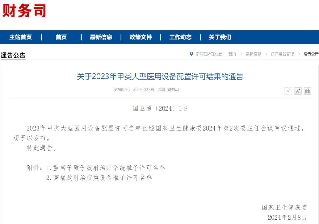 國家衛(wèi)生健康委發(fā)布2023年甲類大型醫(yī)用設(shè)備配置許可結(jié)果