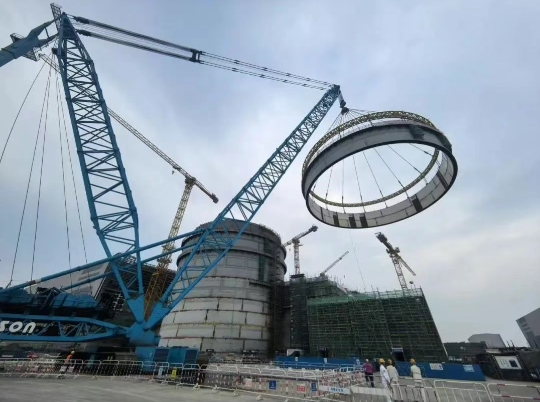 5月6日8時38分,三門核電4號機組核島屏蔽廠房墻體鋼板混凝土結構(SC)第11-12層模塊順利吊裝就位,為4號機組安全殼頂封頭就位里程碑節點實現打下了堅實基礎。本次吊裝的SC11-12層模塊充分秉承應模盡模理念,進一步提升了屏蔽廠房建造效率。該模塊由兩層24個子模塊拼裝而成,整體呈圓筒型,外徑約40米,高約7米,吊裝重量超過600噸。三門核電建設團隊整體協同,全面貫徹中核集團六大控制七個零高質量精細化項目管理要求,在二期工程建設項目指揮中心(PC...