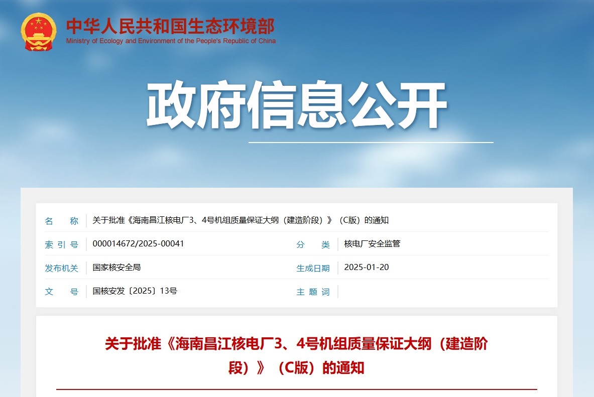 關(guān)于批準(zhǔn)《海南昌江核電廠3、4號(hào)機(jī)組質(zhì)量保證大綱(建造階段)》(C版)的通知