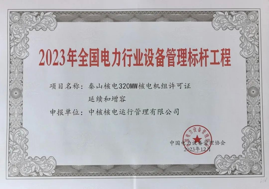 秦山核電申報的《秦山核電320MW核電機組許可證延續和增容》項目,榮獲“2023年全國電力行業設備管理標桿工程”稱號,這也是2023年全國唯一一個獲得標桿工程項目的核電機組,秦山核電受邀在大會作主旨演講。