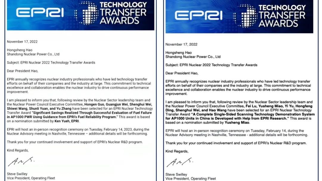 近日,山東核電提報的《對奧氏體不銹鋼管道焊縫單側掃查及以風險為導向的管道焊縫十年在役檢查計劃制定的技術應用》以及《AP1000核電廠燃料可靠性監督及失效評價》2項技術創新成果從全球超400臺機組中脫穎而出,在美國電力研究協會(EPRI)核電板塊技術成果轉化獎評選中獲獎,這也是集團公司在去年首次獲獎后連續第二年獲此殊榮。