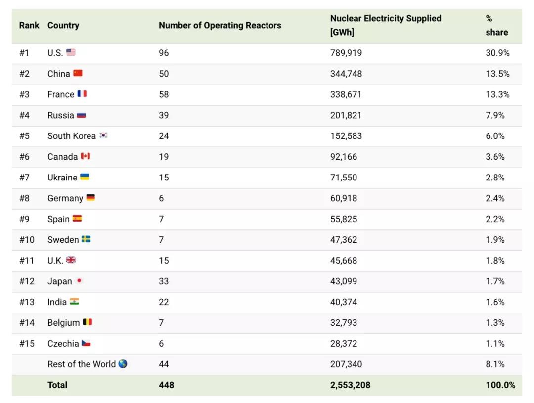 VirtualCapitalist網站發布全球核能信息圖。2020年全世界共有448座核電機組,發電量約占總量的10%,全球一次能源消費的4.3%。但是,盡管一些國家正在發展核能,但核能發電總體上自20世紀90年代達到頂峰以來有所放緩。前15個核電國家占全球核電產量的91%以上。